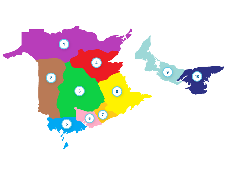 1 - Northern Shore District 2 - River Valley District 3 - Fireside District 4 - Mighty Miramichi District 5 - Southern Shores District 6 - Sandpiper District 7 - Covered Bridges District 8 - High Tides District 9 - Red Sands District 10 - Lady Slipper District